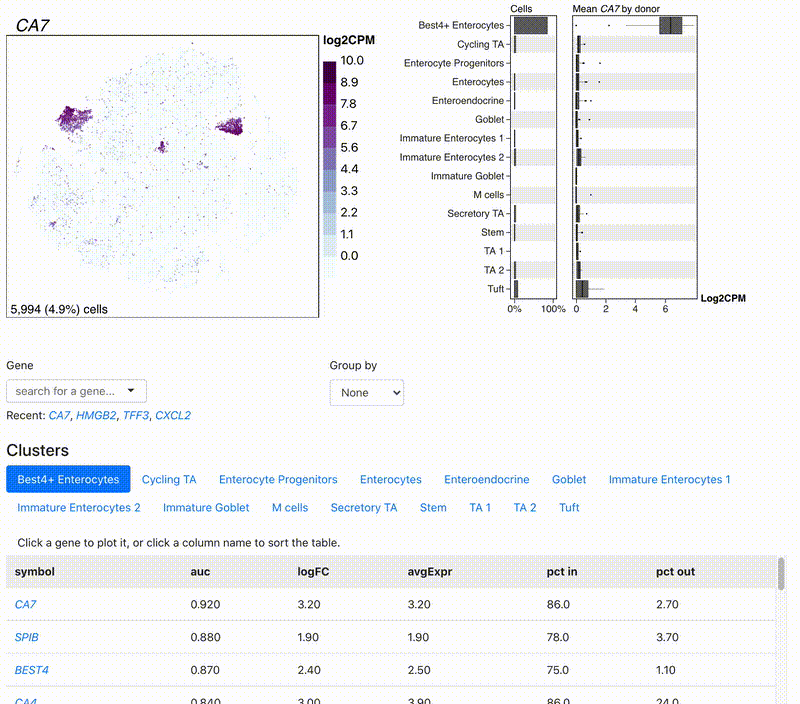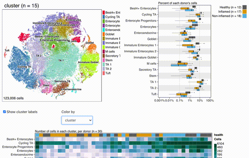Cell Guide is designed for large single-cell RNA-seq datasets with multiple cell types and donor variables, such as the dataset from an article by Smillie et al. 2019: